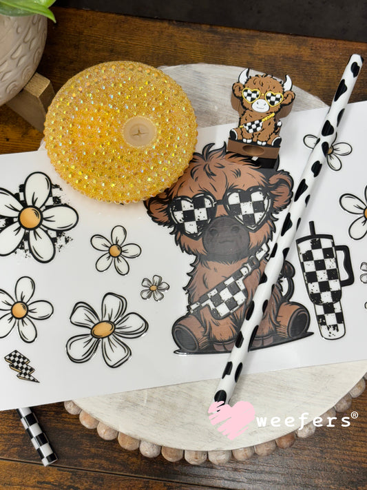 Straw Topper Buddy - Checkered Highland Cow Black and Yellow (fits both 8mm and 10mm Straws)