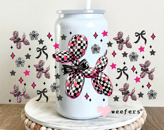 Black and White Checkered Pink Balloon Dog Teal Bow UV DTF Cup Wrap