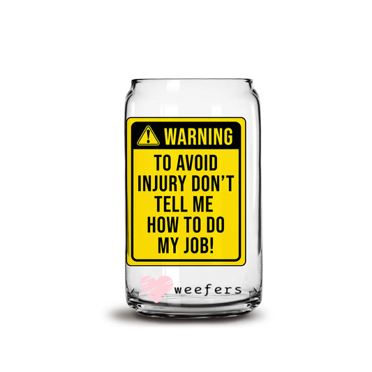 Warning to Avoid Injury Don't Tell Me how to do My Job 16oz Libbey Glass Can UV DTF or Sublimation Wrap - Decal