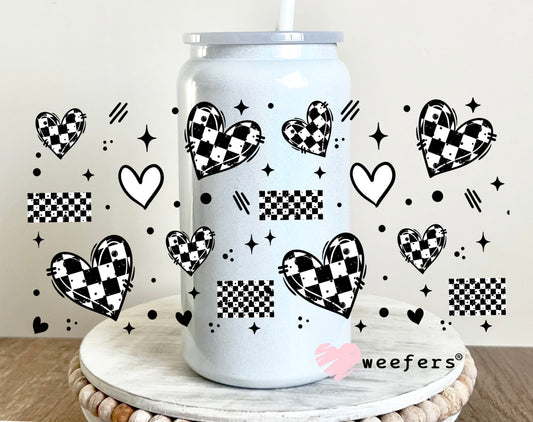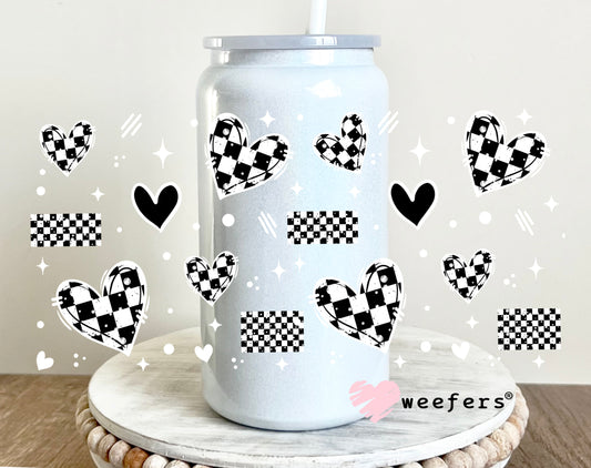 Black and White Checkered Hearts White UV DTF Cup Wrap