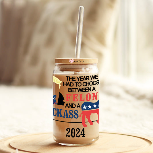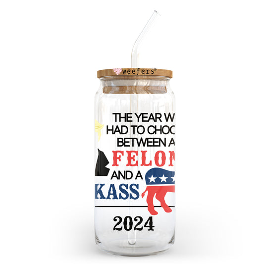 The Year We had to Choose Between a Felon and a Jackass 20oz Libbey Glass Can, 34oz Hip Sip, 40oz Tumbler, 24oz Cold Cup UV DTF or Sublimation Decal Transfer