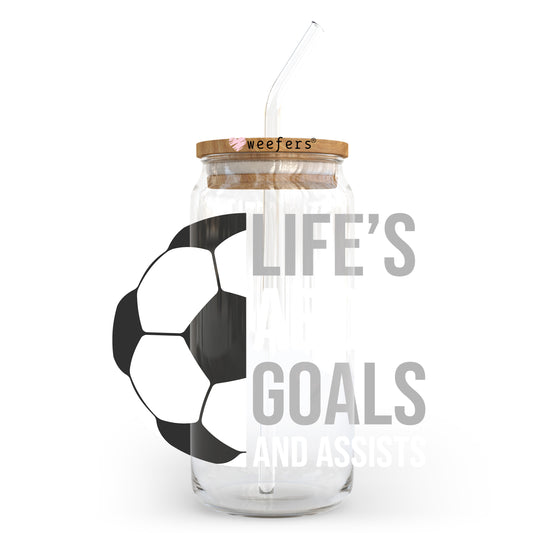 Life's About Goals and Assists Soccer 20oz Libbey Glass Can UV DTF or Sublimation Wrap - Decal Transfer