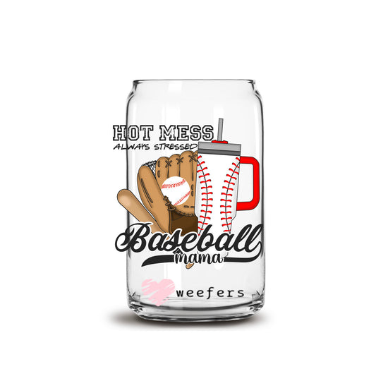 Hot Mess Always Stressed Baseball Mom 16oz Libbey Glass Can UV DTF or Sublimation Cup Wrap - Decal Transfers