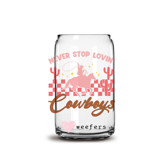 Never Stop Lovin' Cowboys Valentine's Day 16oz Libbey Glass Can UV DTF or Sublimation Cup Wrap - Decal Transfer
