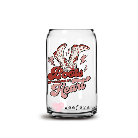 Boots Never Broke My Heart Valentine's Day 16oz Libbey Glass Can UV DTF or Sublimation Cup Wrap - Decal Transfer