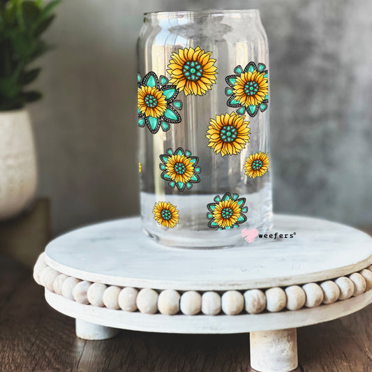 Turquoise Sunflowers Libbey Glass Can UV DTF or Sublimation Wrap - Decal