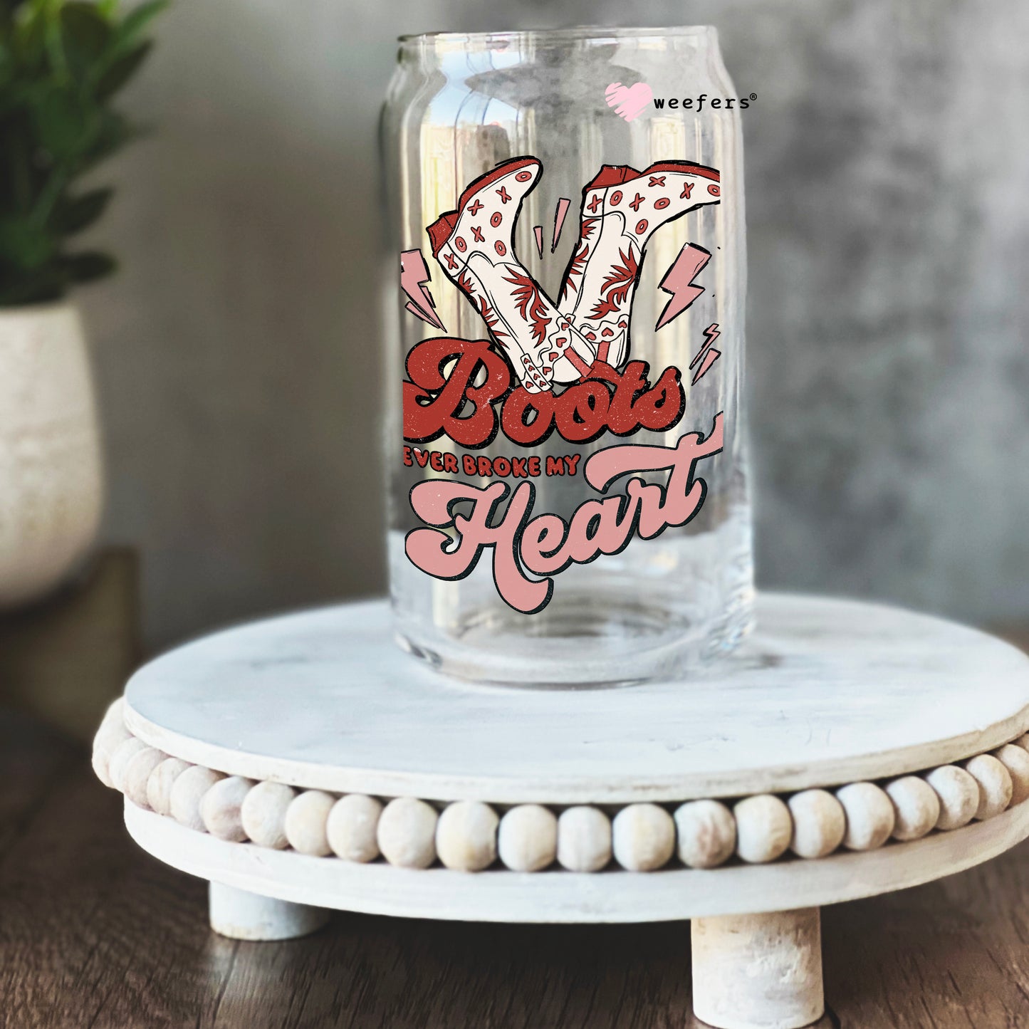 Boots Never Broke My Heart Valentine's Day 16oz Libbey Glass Can UV DTF or Sublimation Cup Wrap - Decal Transfer