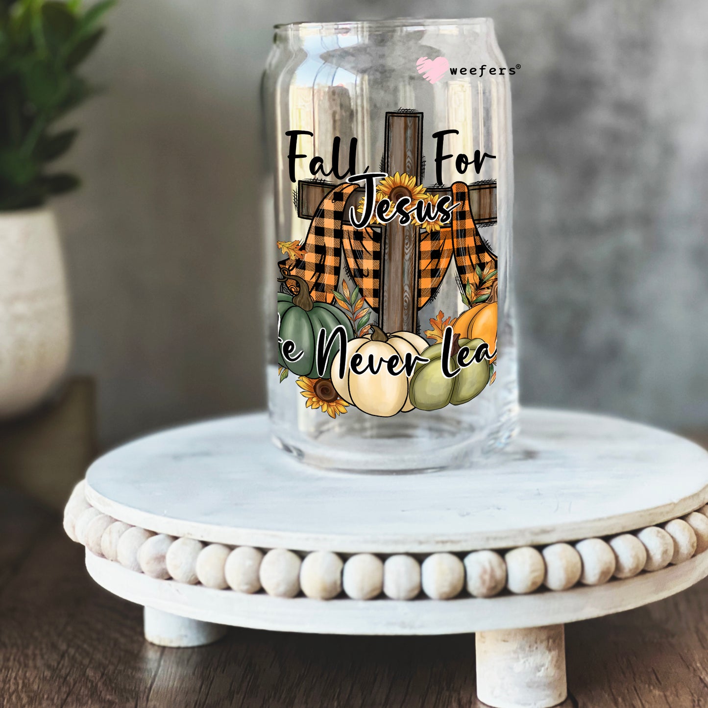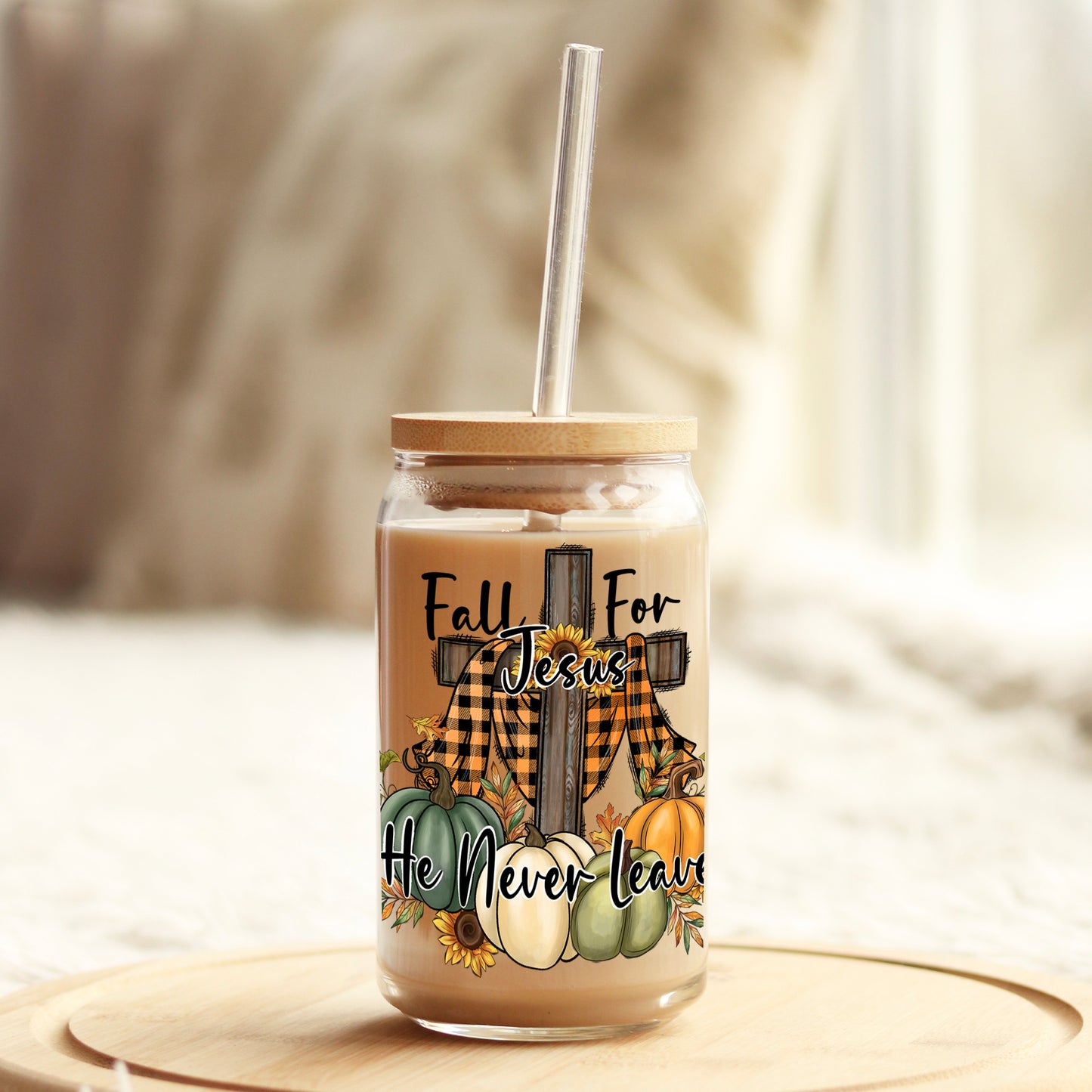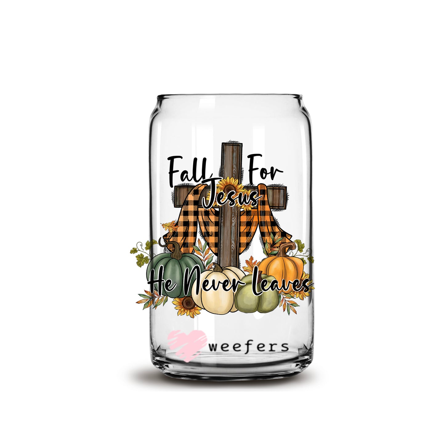 Fall For Jesus He Never Leaves 16oz Libbey Glass Can UV DTF or Sublimation Wrap - Decal