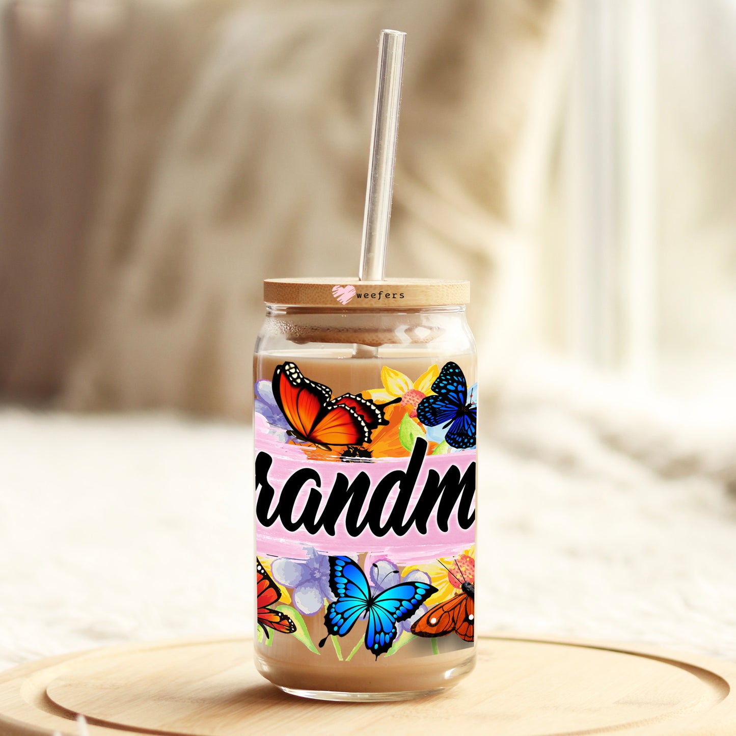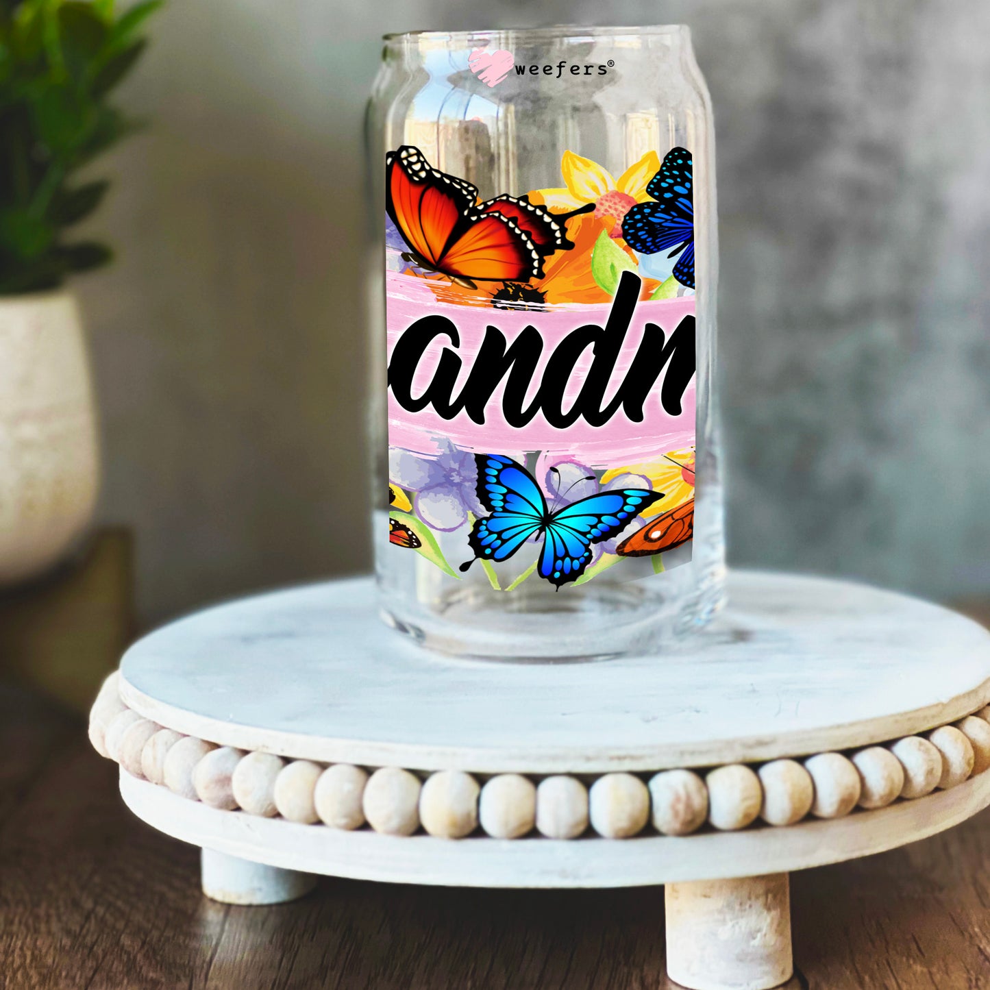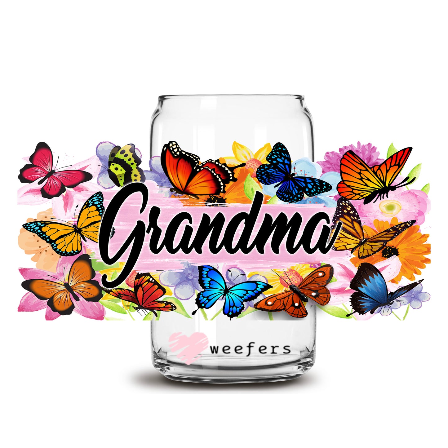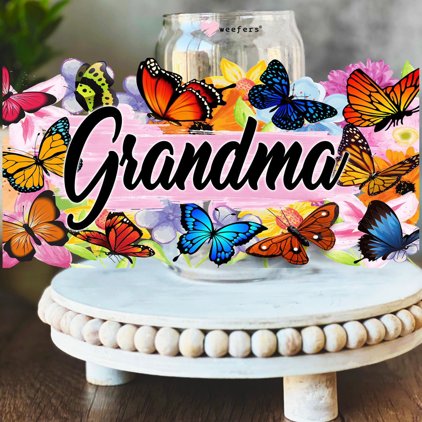Grandma Colorful Butterflies 16oz Libbey Glass Can UV DTF or Sublimation Wrap Decal Transfer