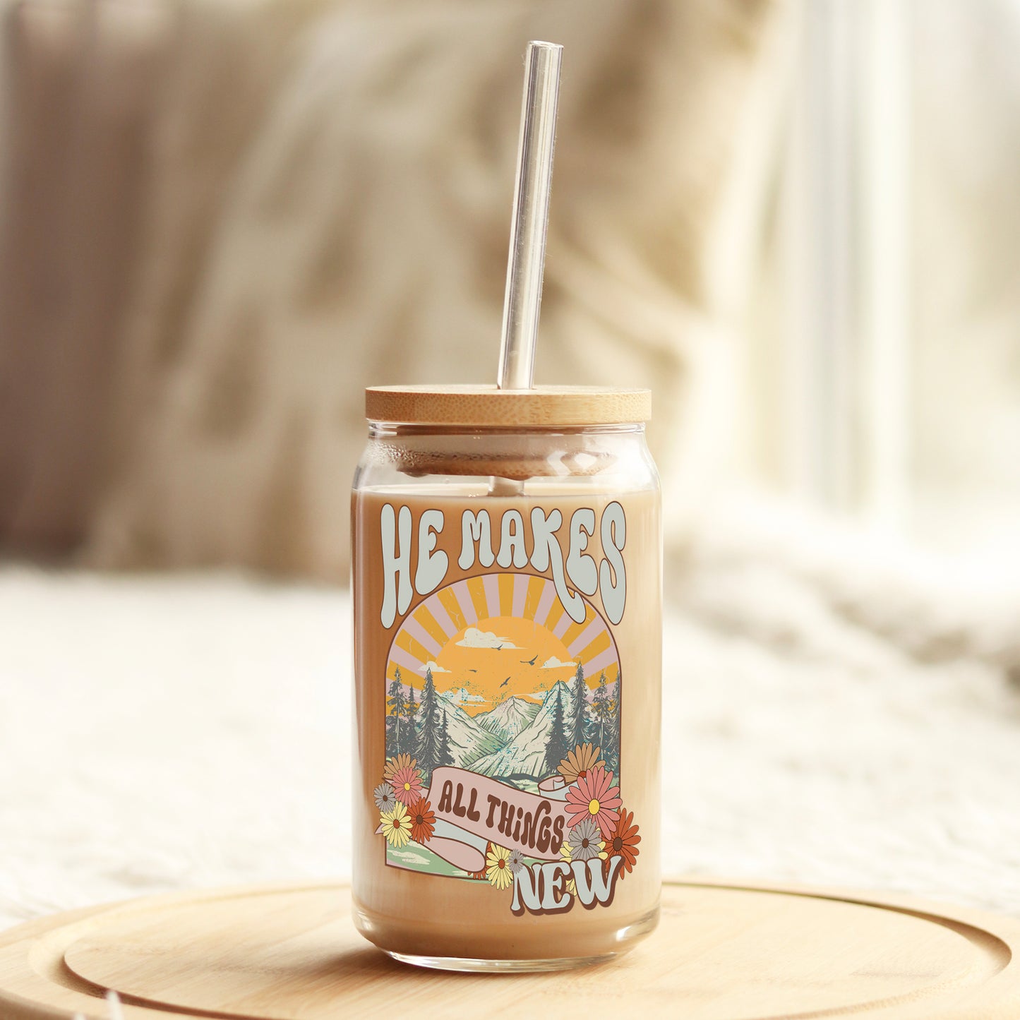 He makes all things new Christian 16oz Libbey Glass Can UV DTF or Sublimation Wrap - Decal Description