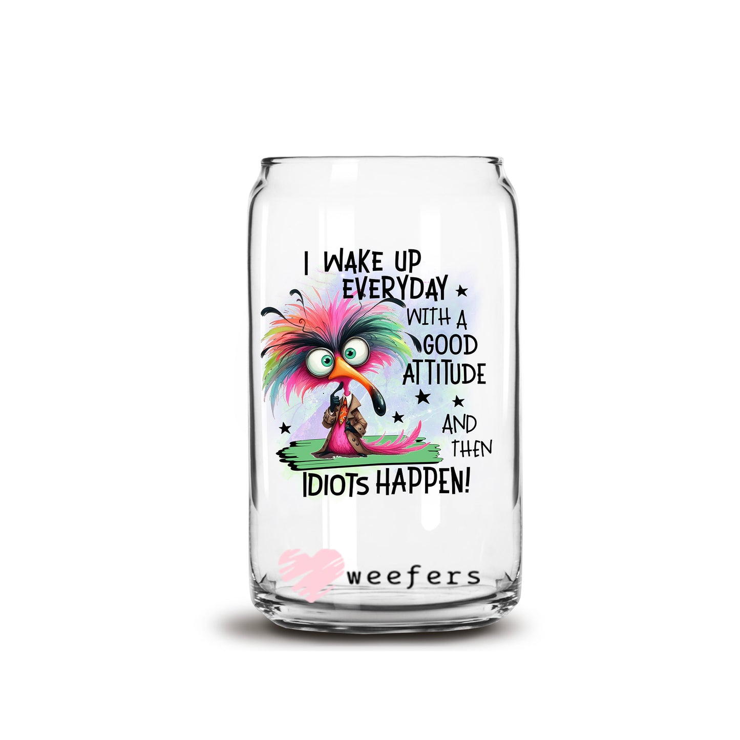 I Wake Up Everyday with a Good Attitude and Then Idiots Happen 16oz Libbey Glass Can UV DTF or Sublimation Wrap - Decal Transfer Description