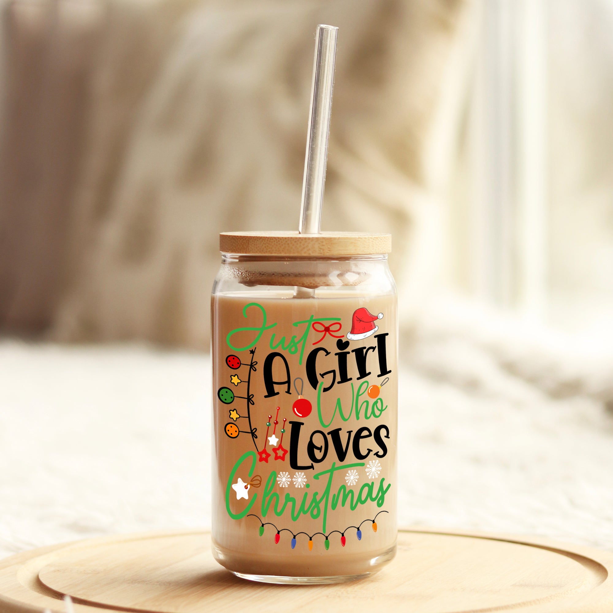 Just a Girl that Loves Christmas 16oz Libbey Glass Can UV DTF or Sublimation Wrap - Decal Description