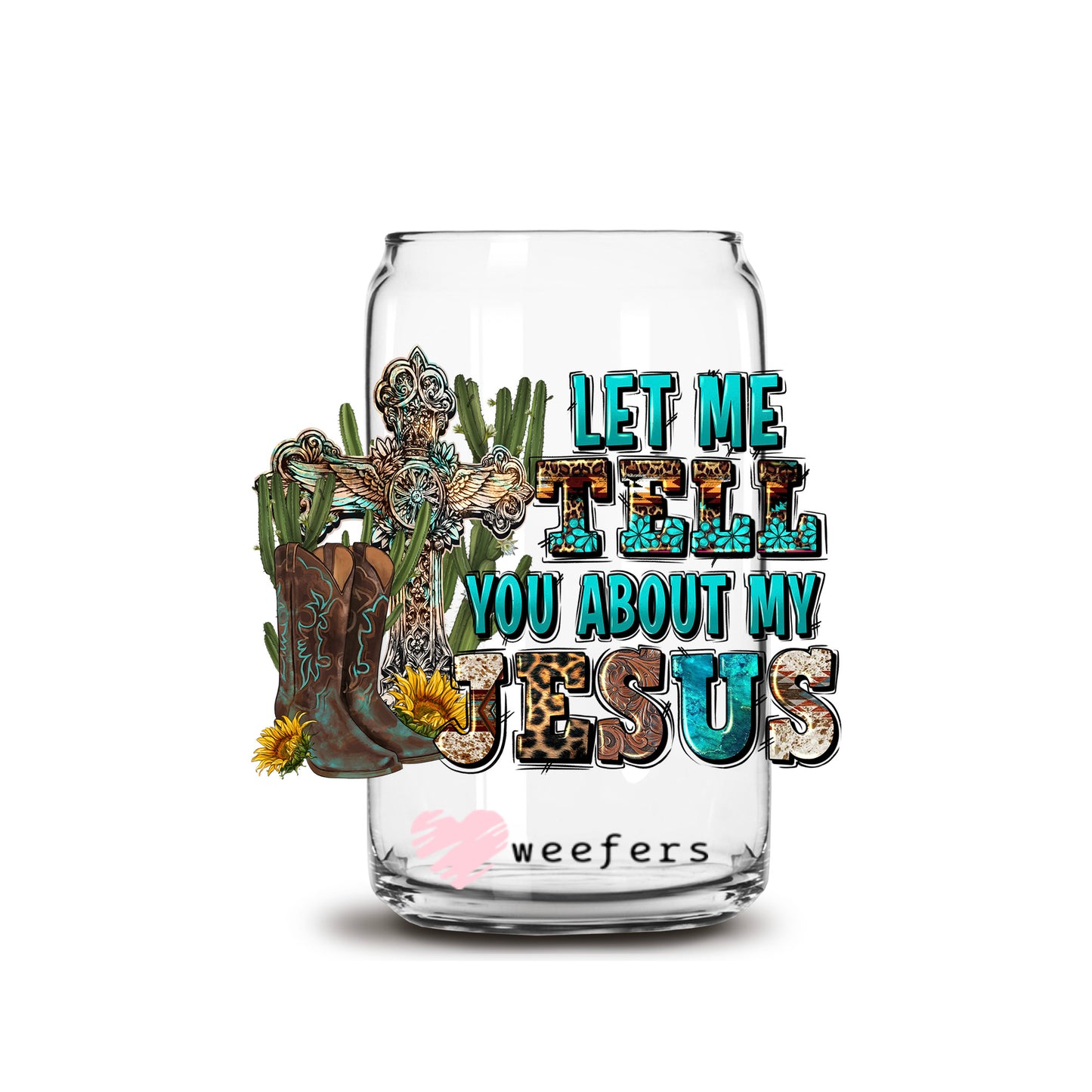 Let Me Tell You About My Jesus Western 16oz Libbey Glass Can UV DTF or Sublimation Cup Wrap - Decal Transfer Description