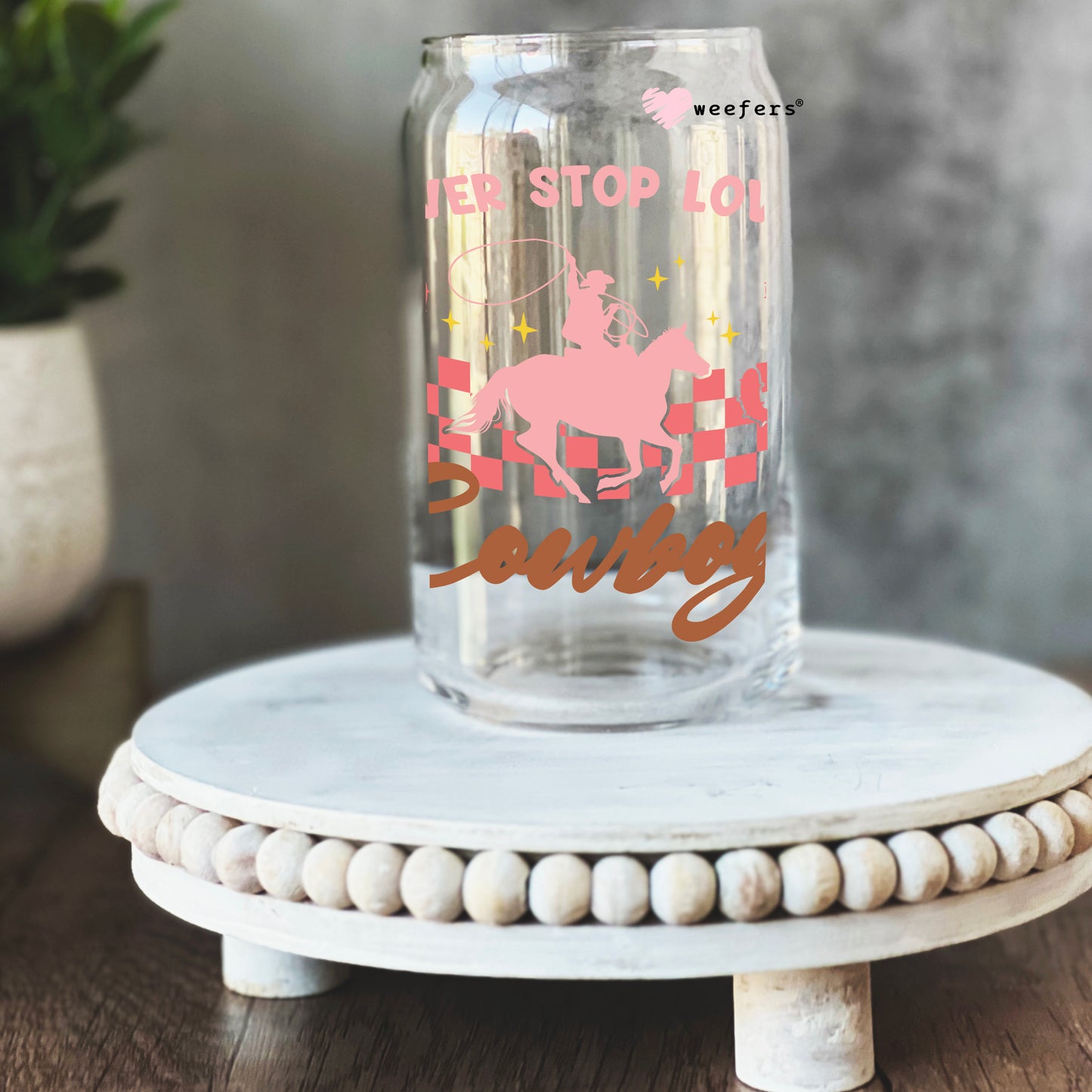 Never Stop Lovin' Cowboys Valentine's Day 16oz Libbey Glass Can UV DTF or Sublimation Cup Wrap - Decal Transfer Description