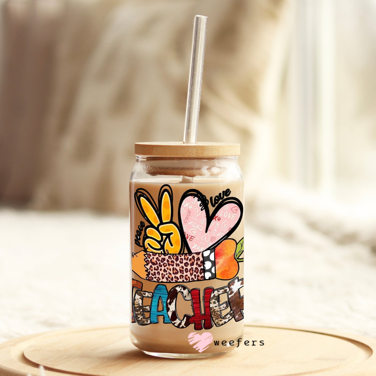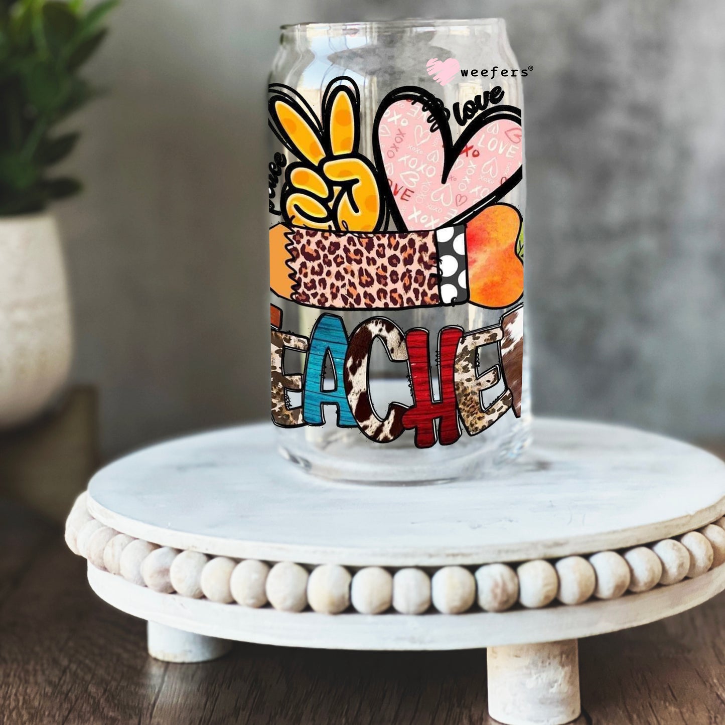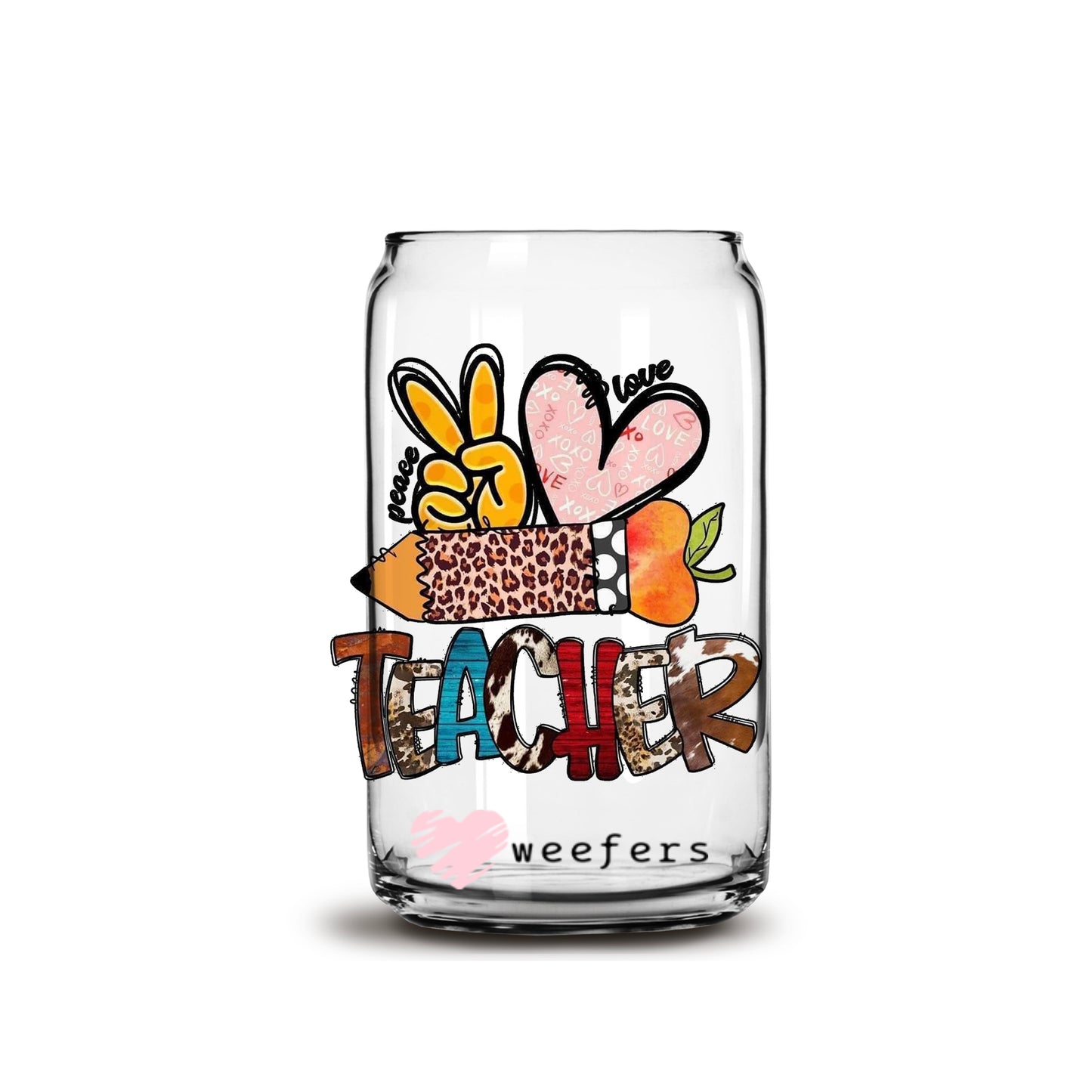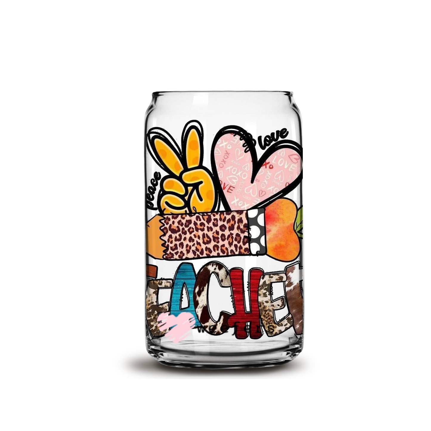 Peace, Love, Teacher 16oz Libbey Glass Can UV DTF or Sublimation Wrap - Decal