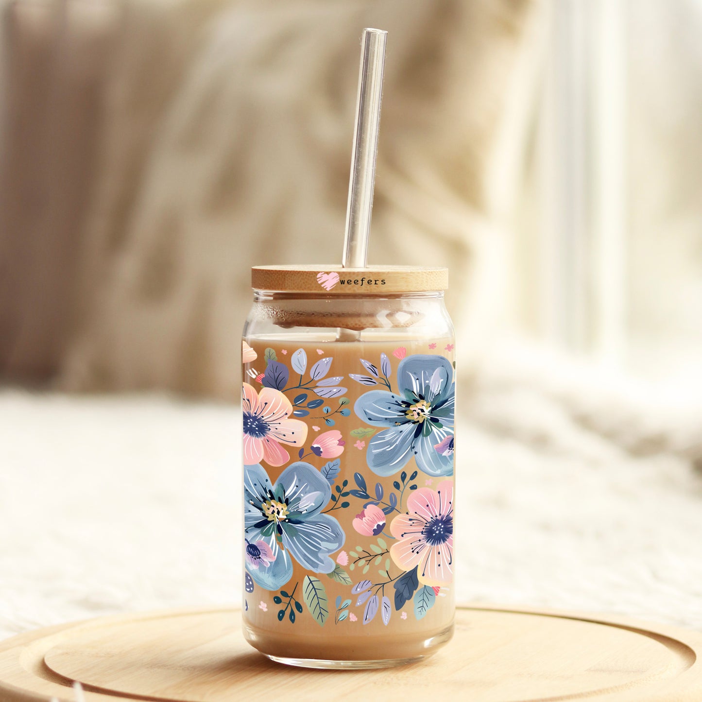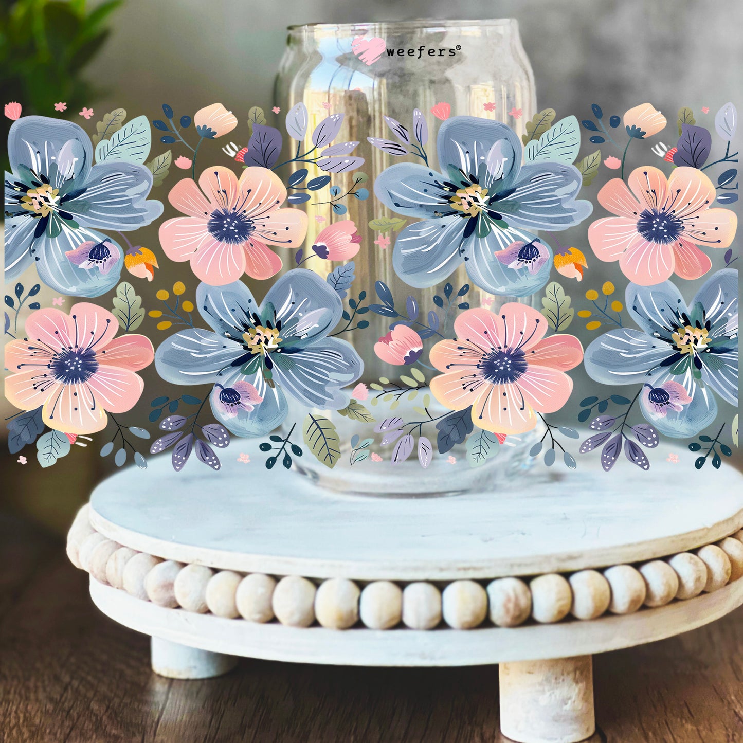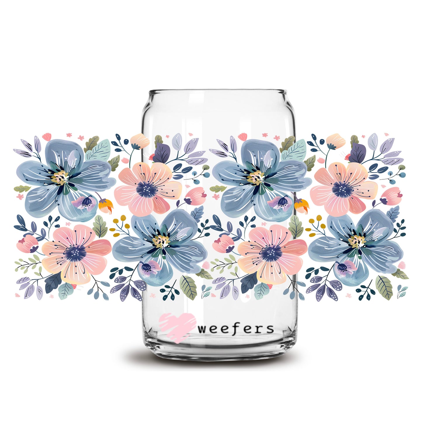 Pink and Blue Flowers 16oz Libbey Glass Can UV DTF or Sublimation Wrap Decal Transfer