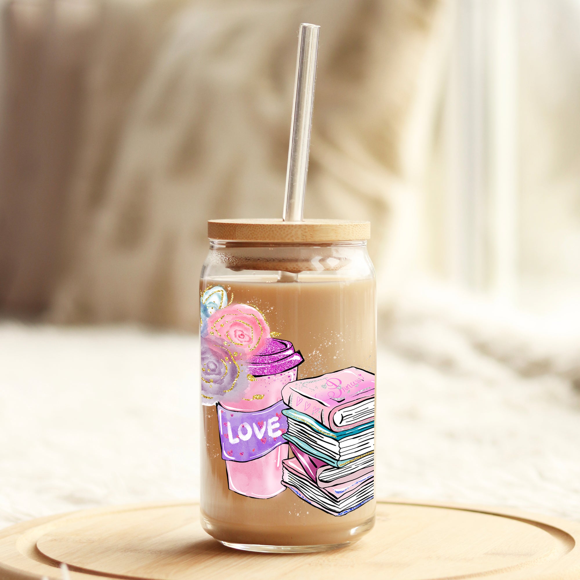 Pink Love Books 16oz Libbey Glass Can UV DTF or Sublimation Wrap - Decal Description