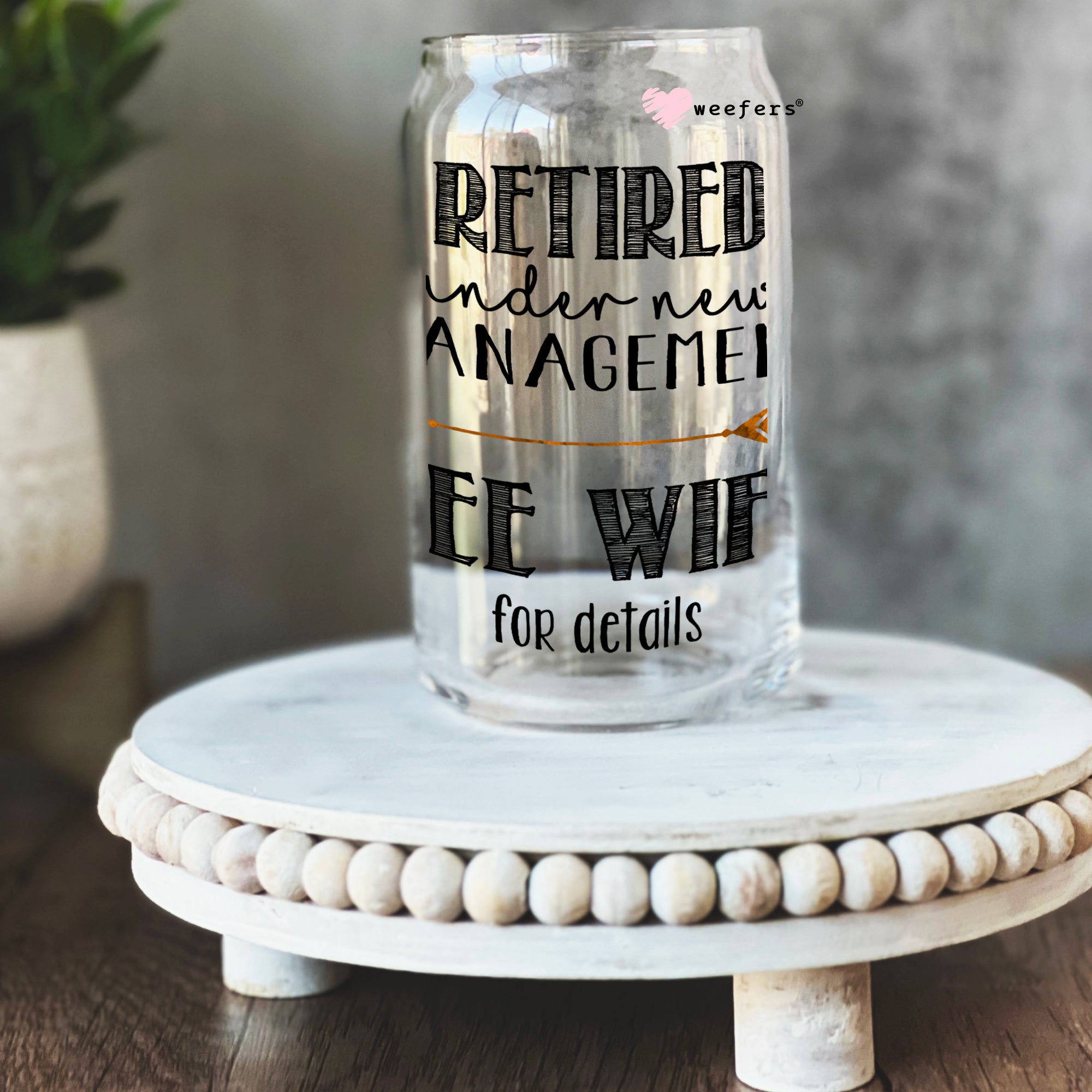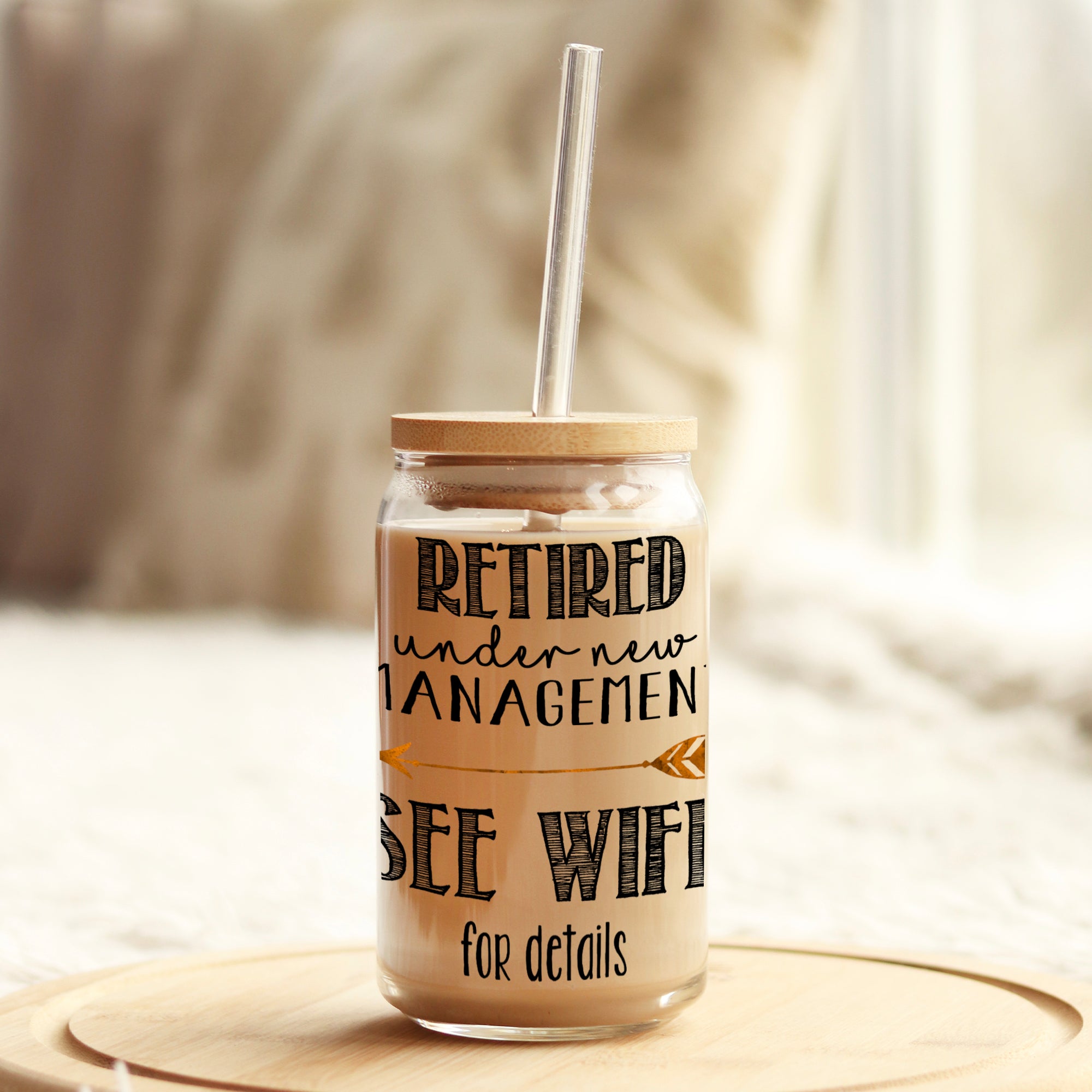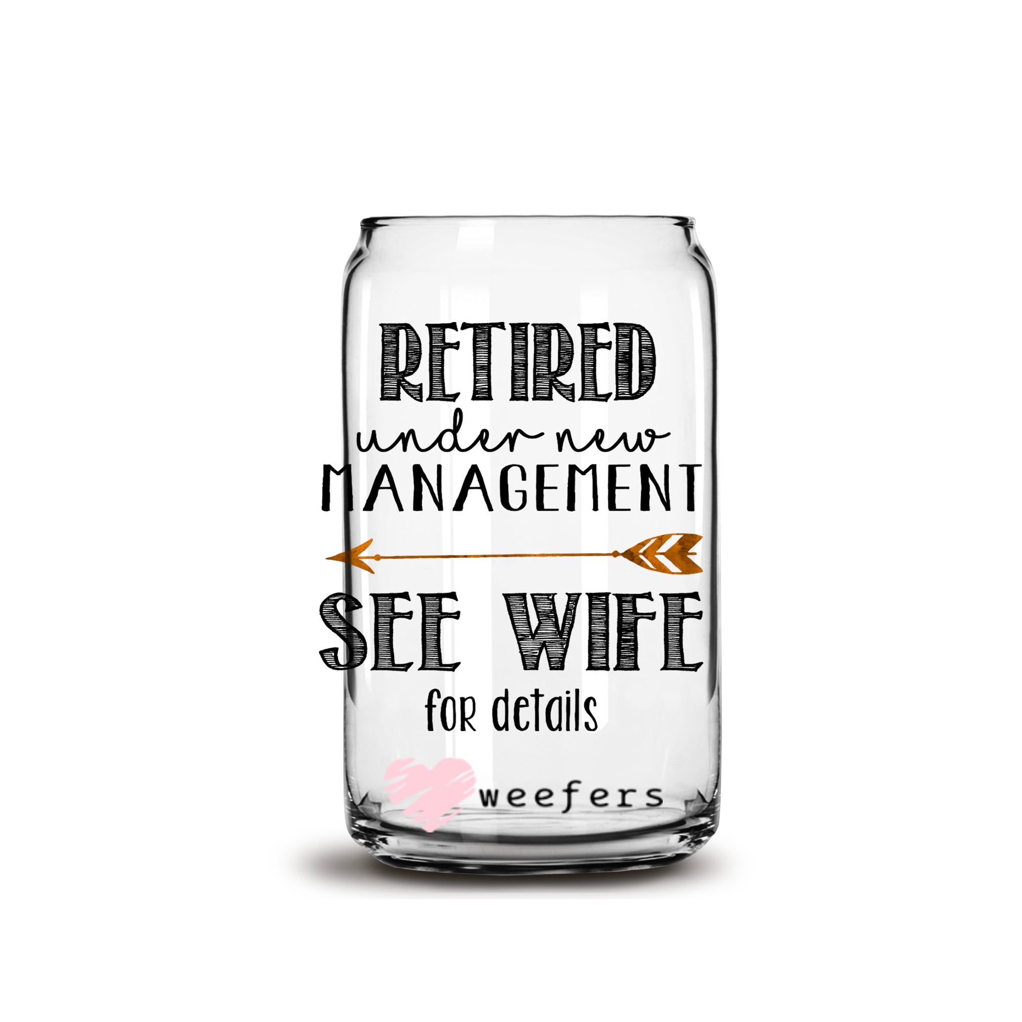 Retired Under New Management See Wife for Details 16oz Libbey Glass Can UV DTF or Sublimation Wrap - Decal Description