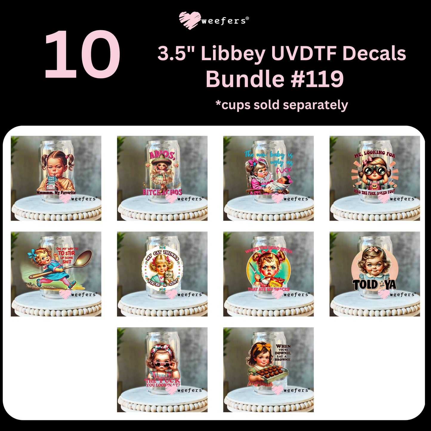 - (10) 3.5" UV DTF Glass Can Decals as pictured (Orig. 16oz Libbey Glass Can)