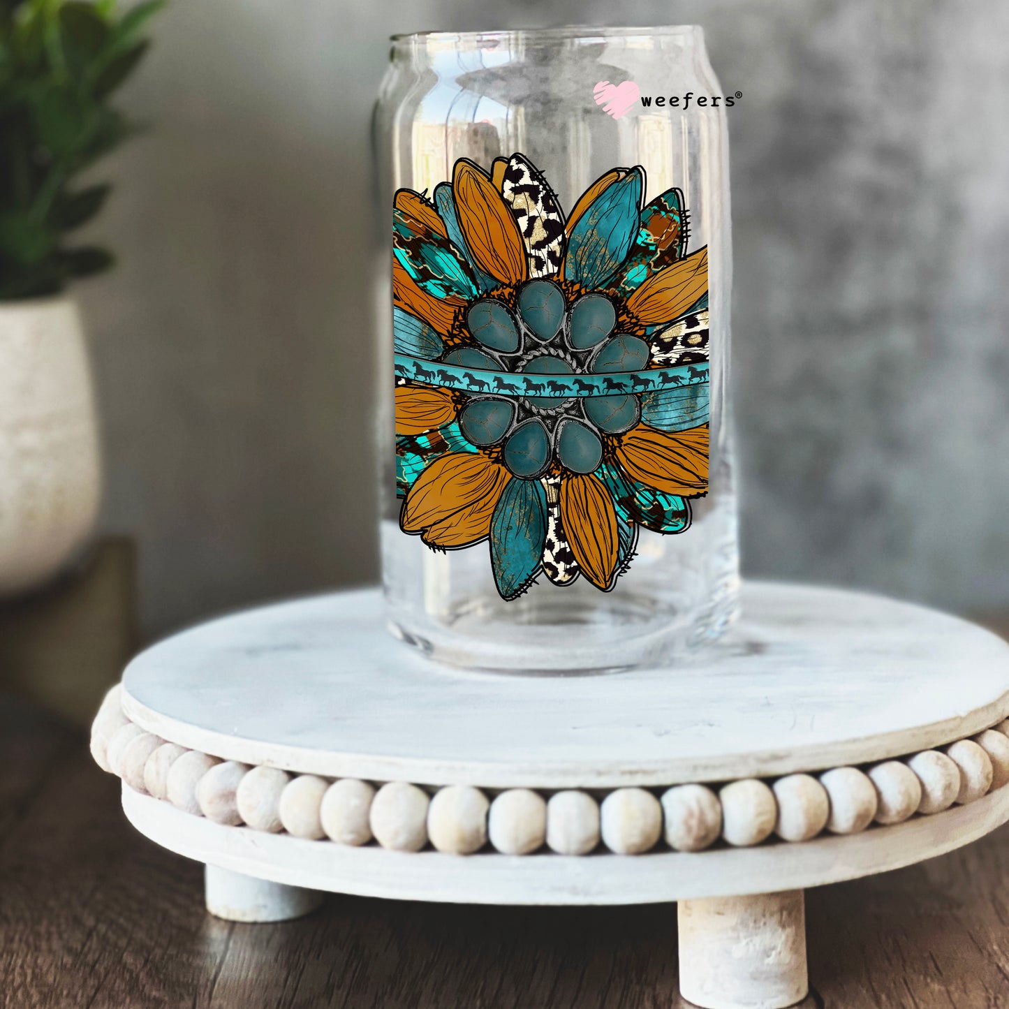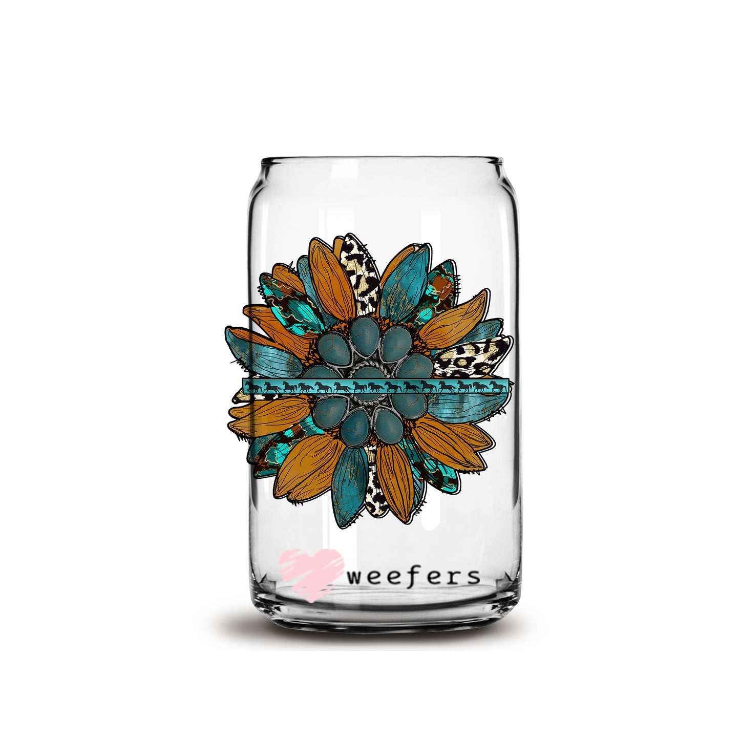 Western Turquoise Sunflower 16oz Libbey Glass Can UV DTF or Sublimation Cup Wrap - Decal Transfer
