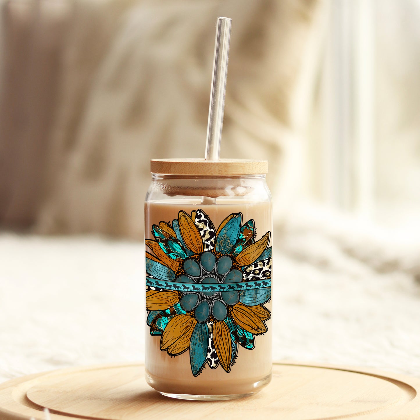 Western Turquoise Sunflower 16oz Libbey Glass Can UV DTF or Sublimation Cup Wrap - Decal Transfer Description